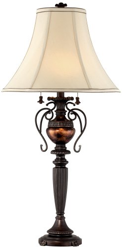 This handsome table lamp features a fluted base with bronze finish and a tortoise shell painted font. Twin handles and dual pull chains allude to this lamp's two bulbs. The lovely off-white bell shade contains and complements the energetic design of the base.